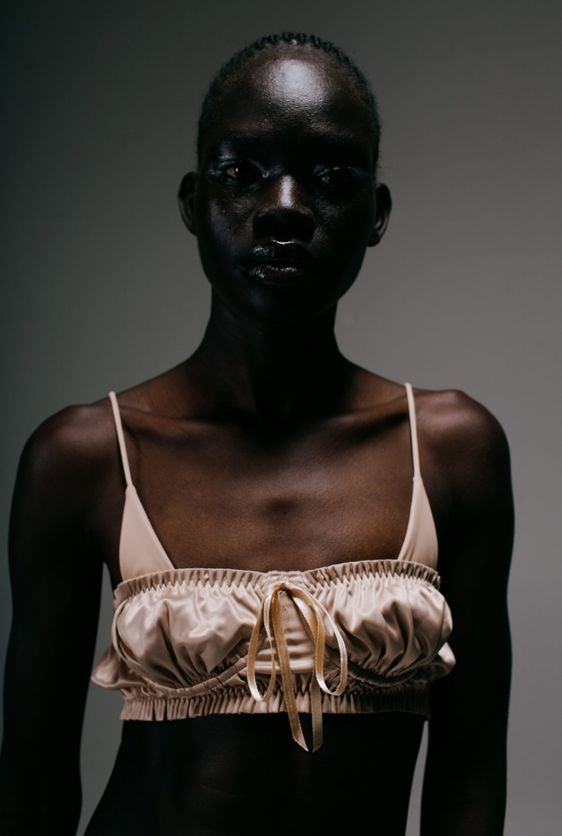 Boudoir-chic atlas brassiere, named Alexander for the set’s dark romanticism.