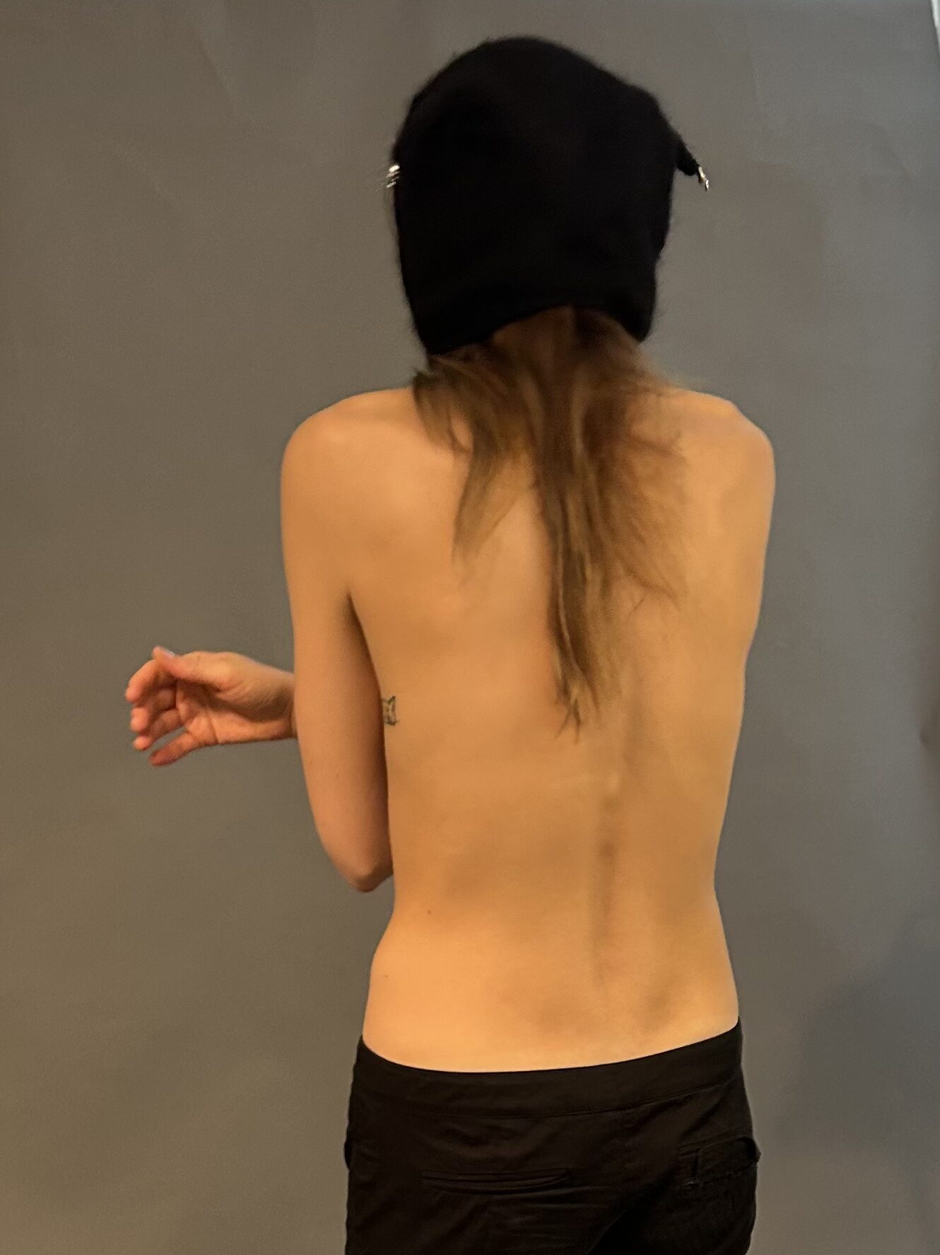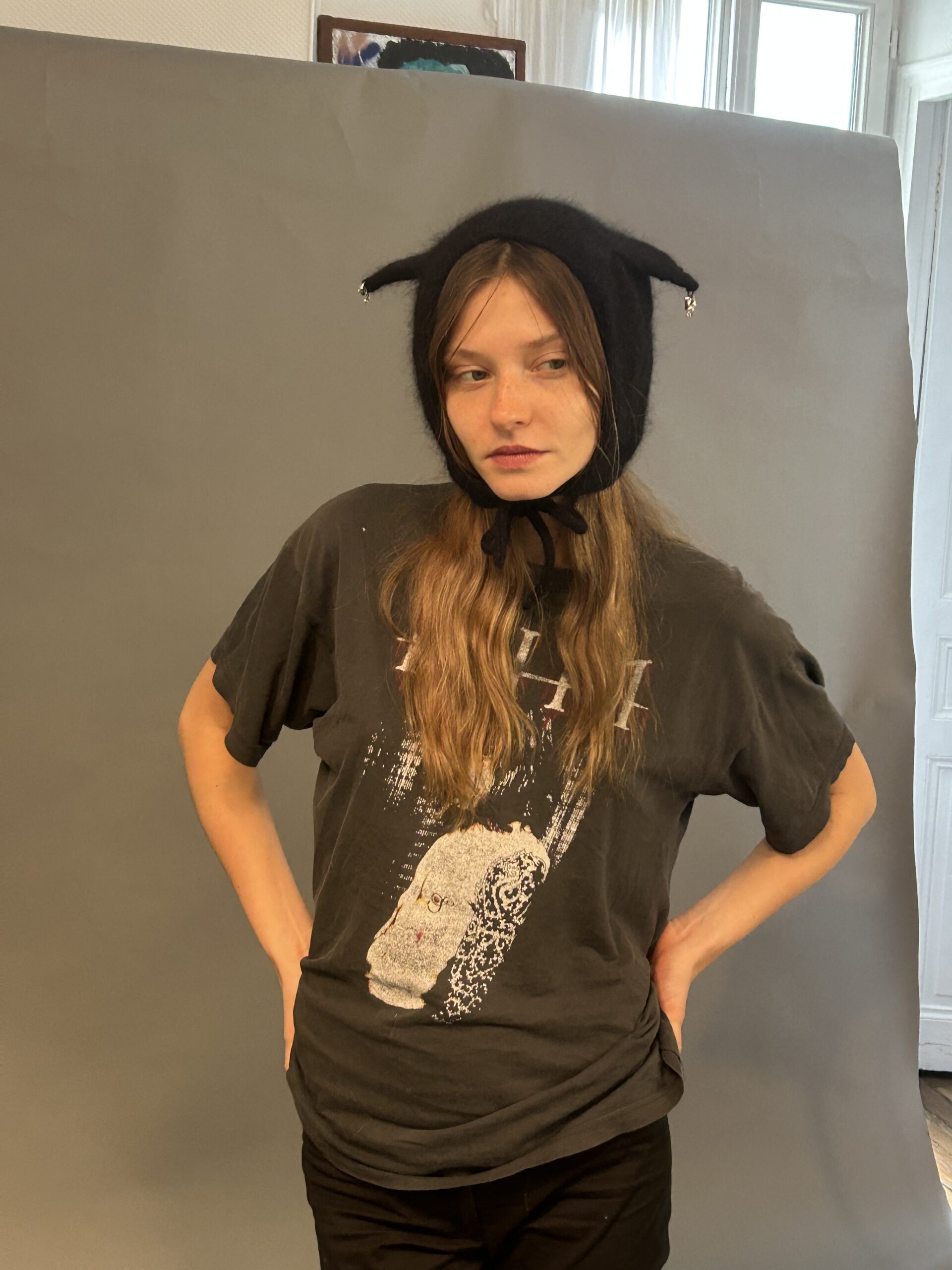 Hat in mink feather with stiff pointy ears, hand-knitted in Ukraine.