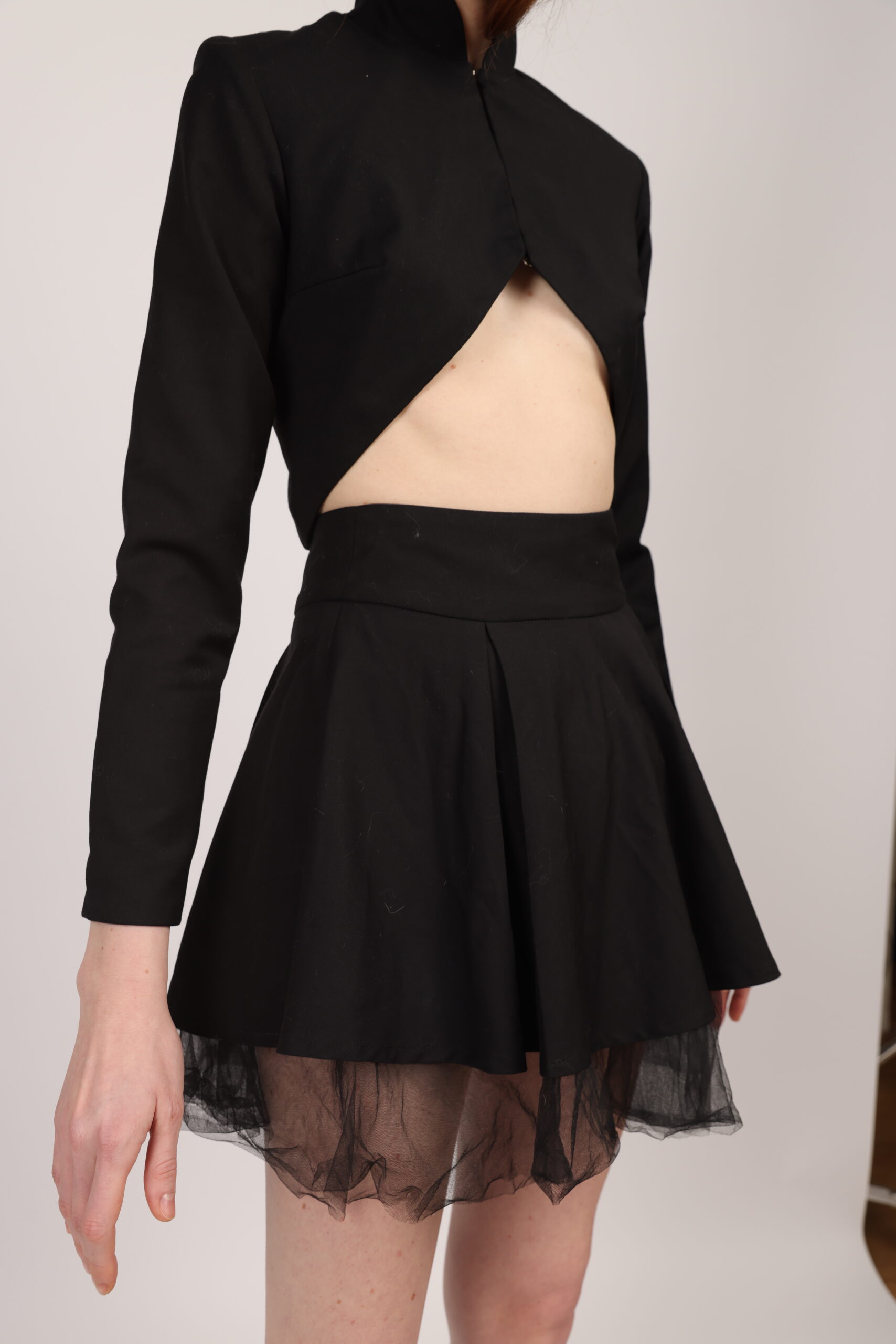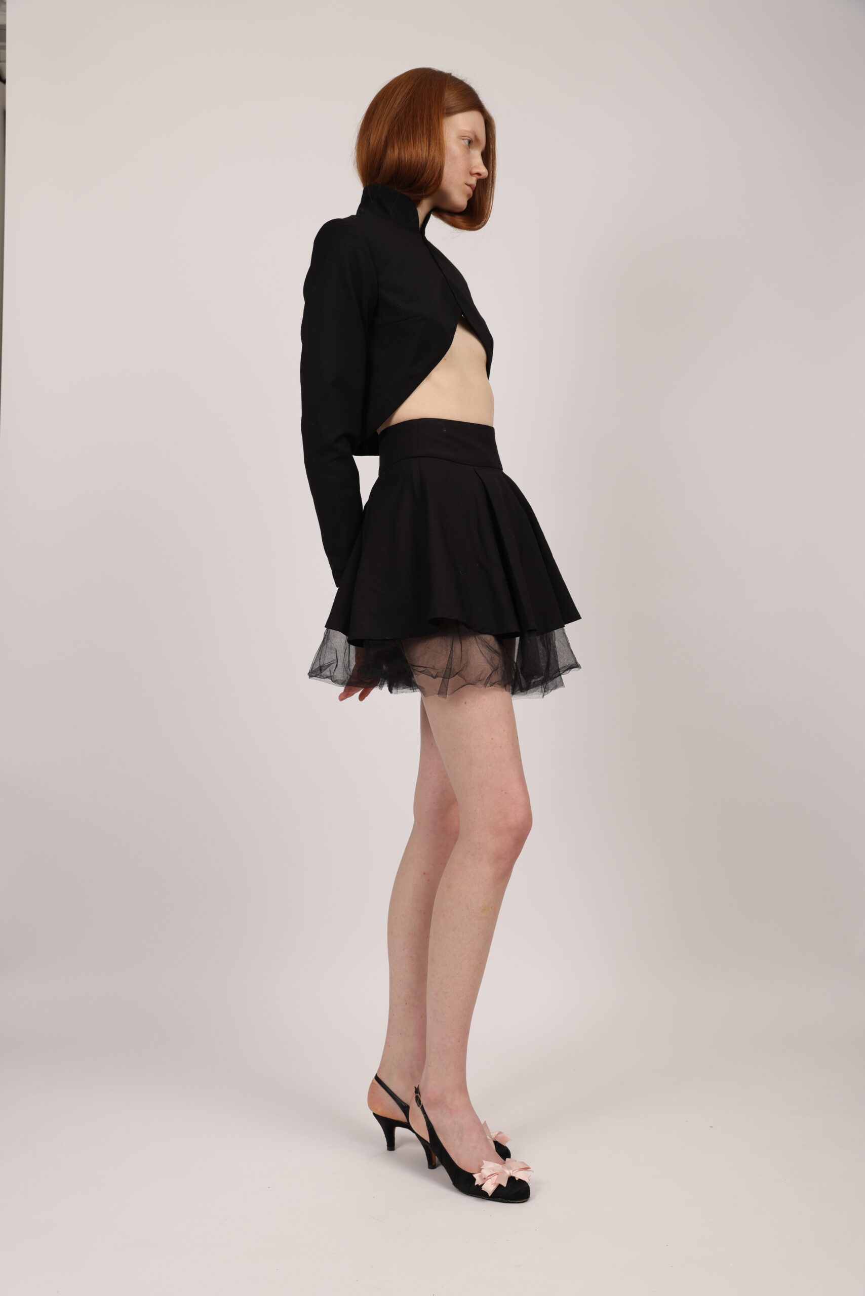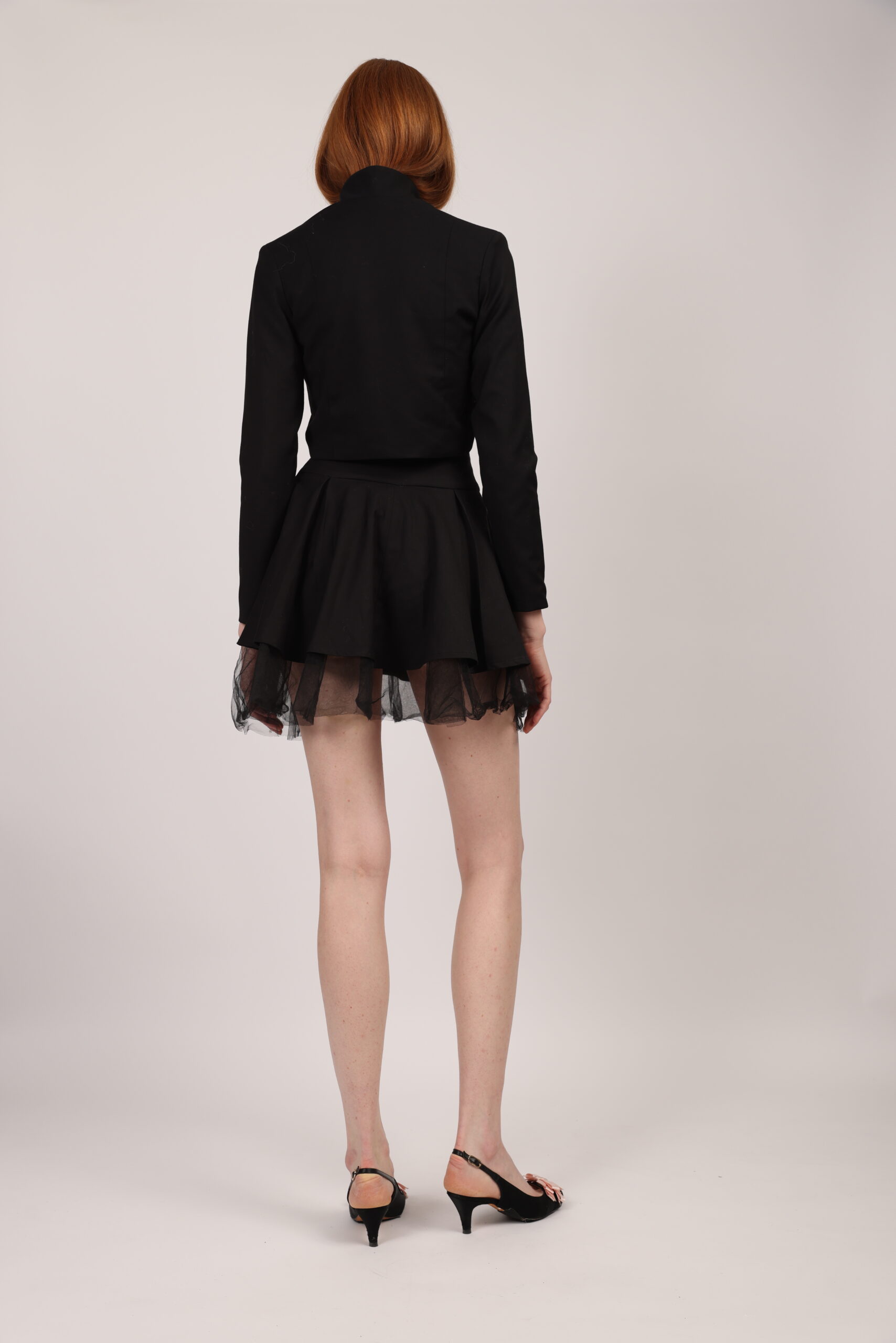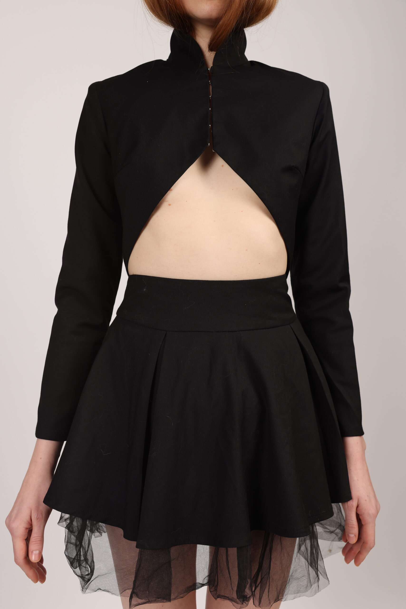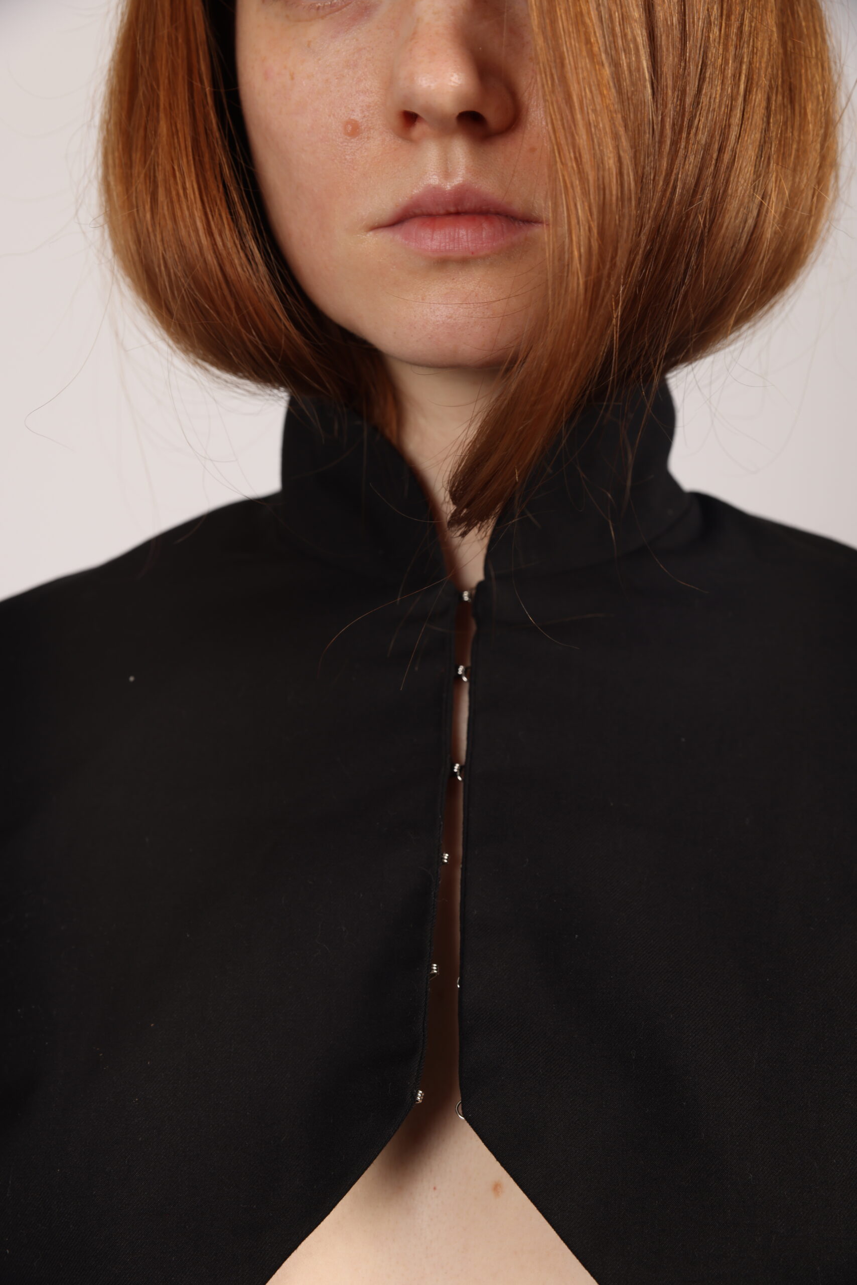 French Revolution is a cropped structured fit jacket with a high-neck collar, asymmetrical front cutout with hook-and-eye concealed closure at the collar and shoulder pads.