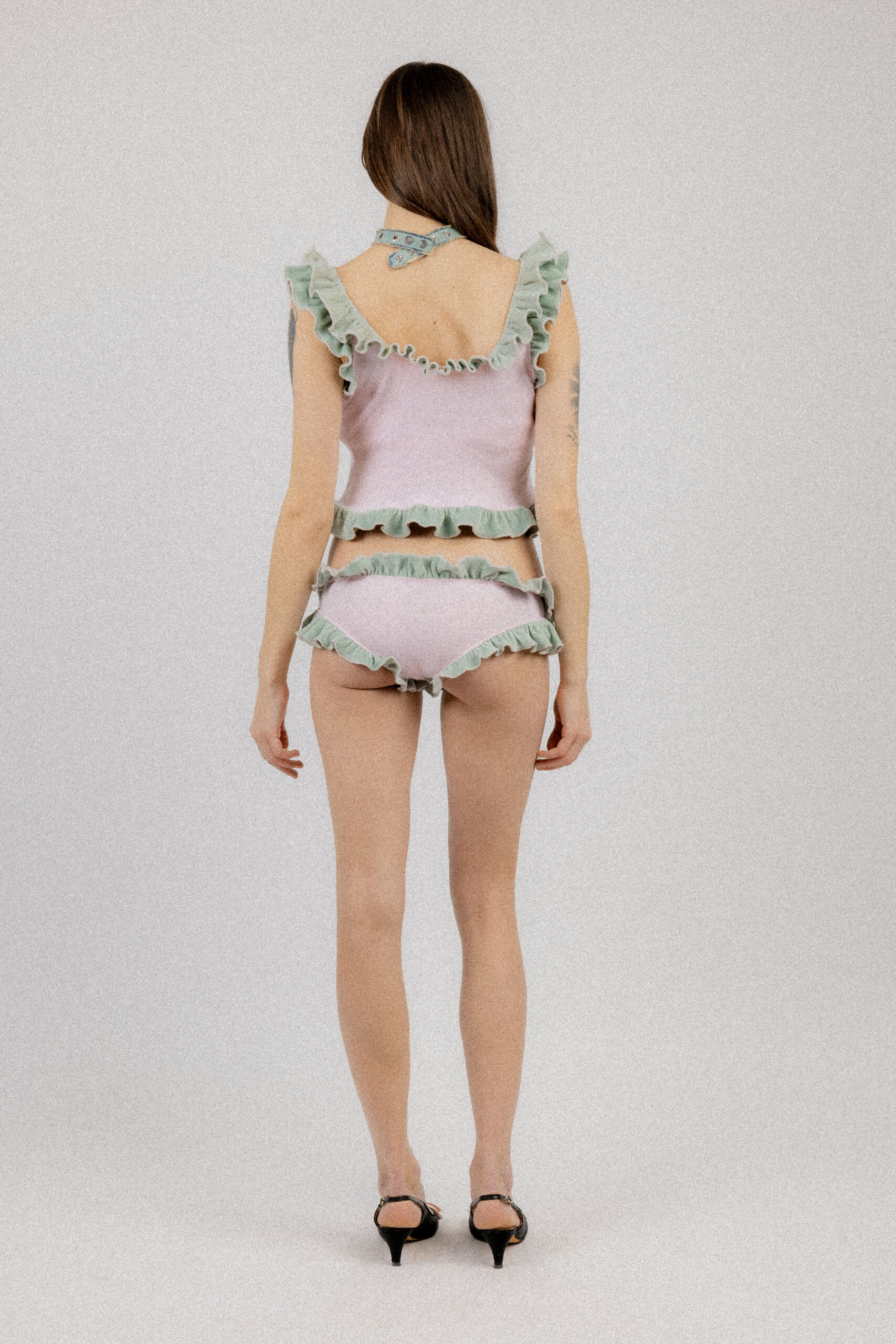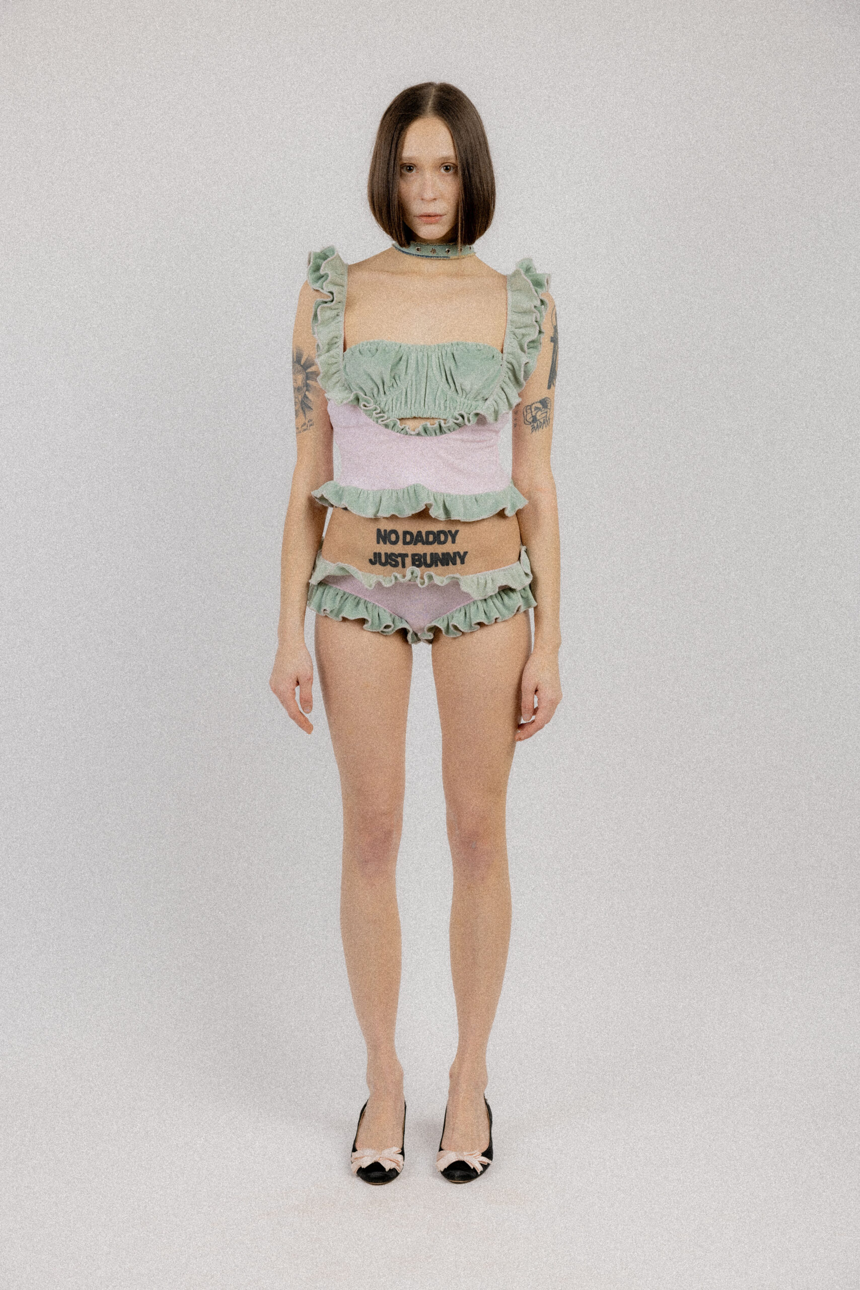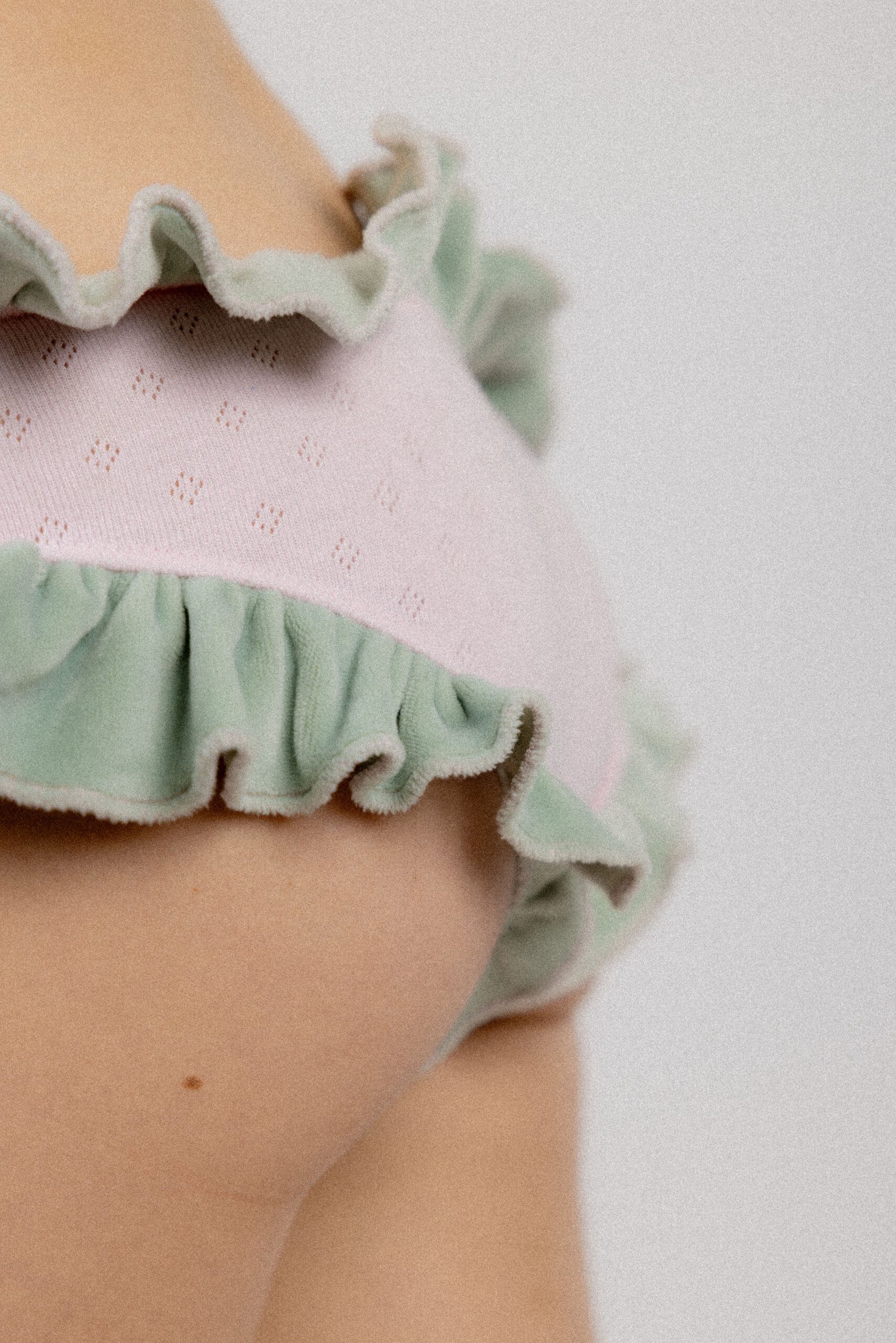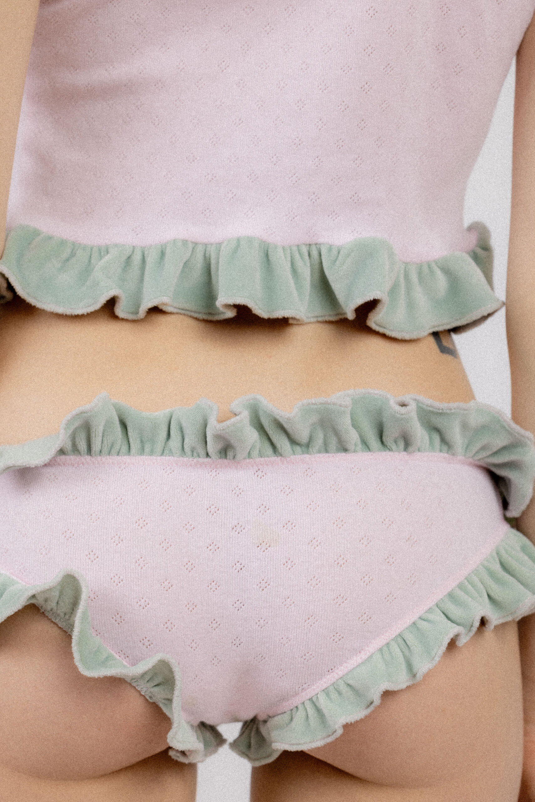 MERCI BIMBO set made in three pieces, in velvet and cotton, set of panties, bra and tank top with velvet ruffles.