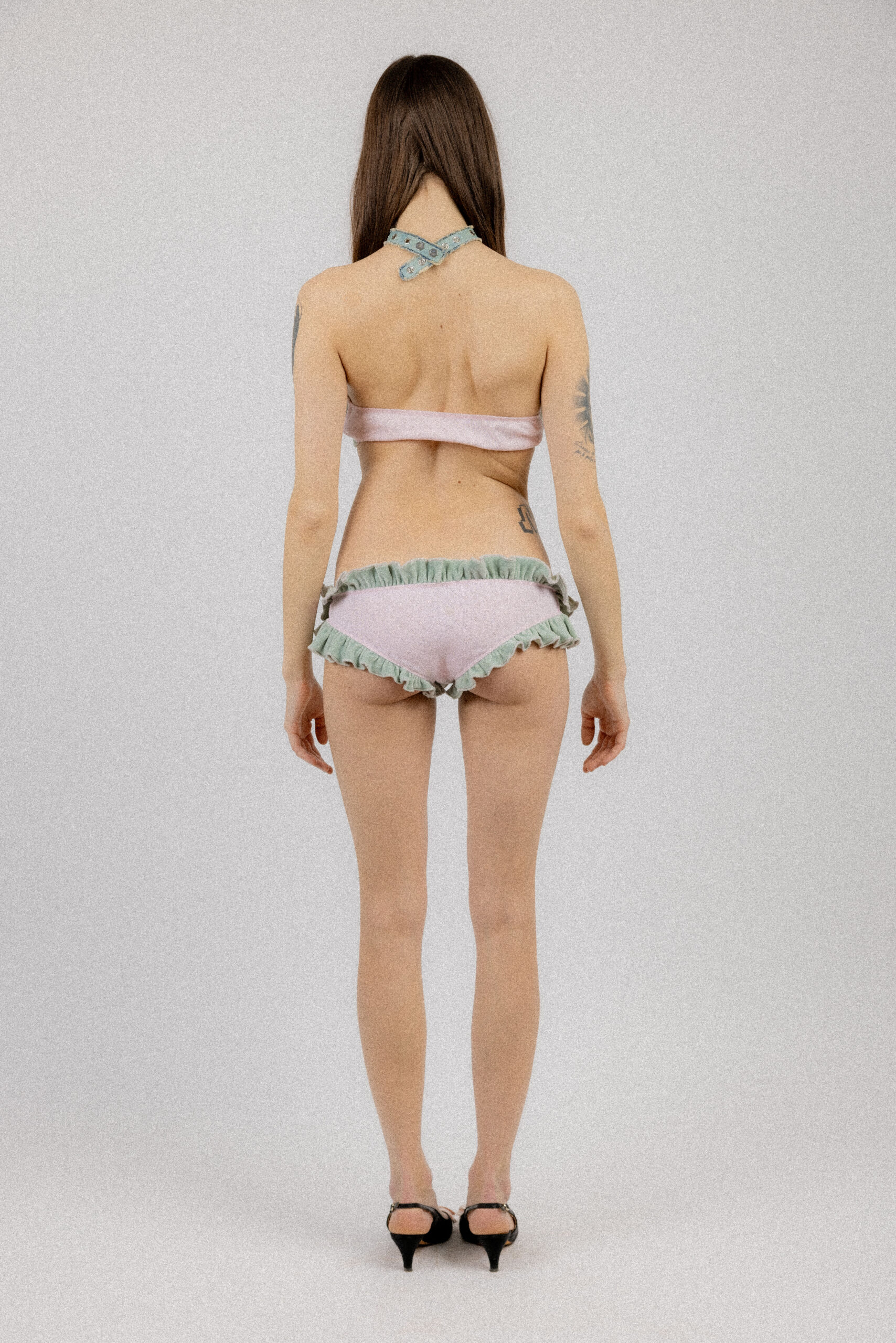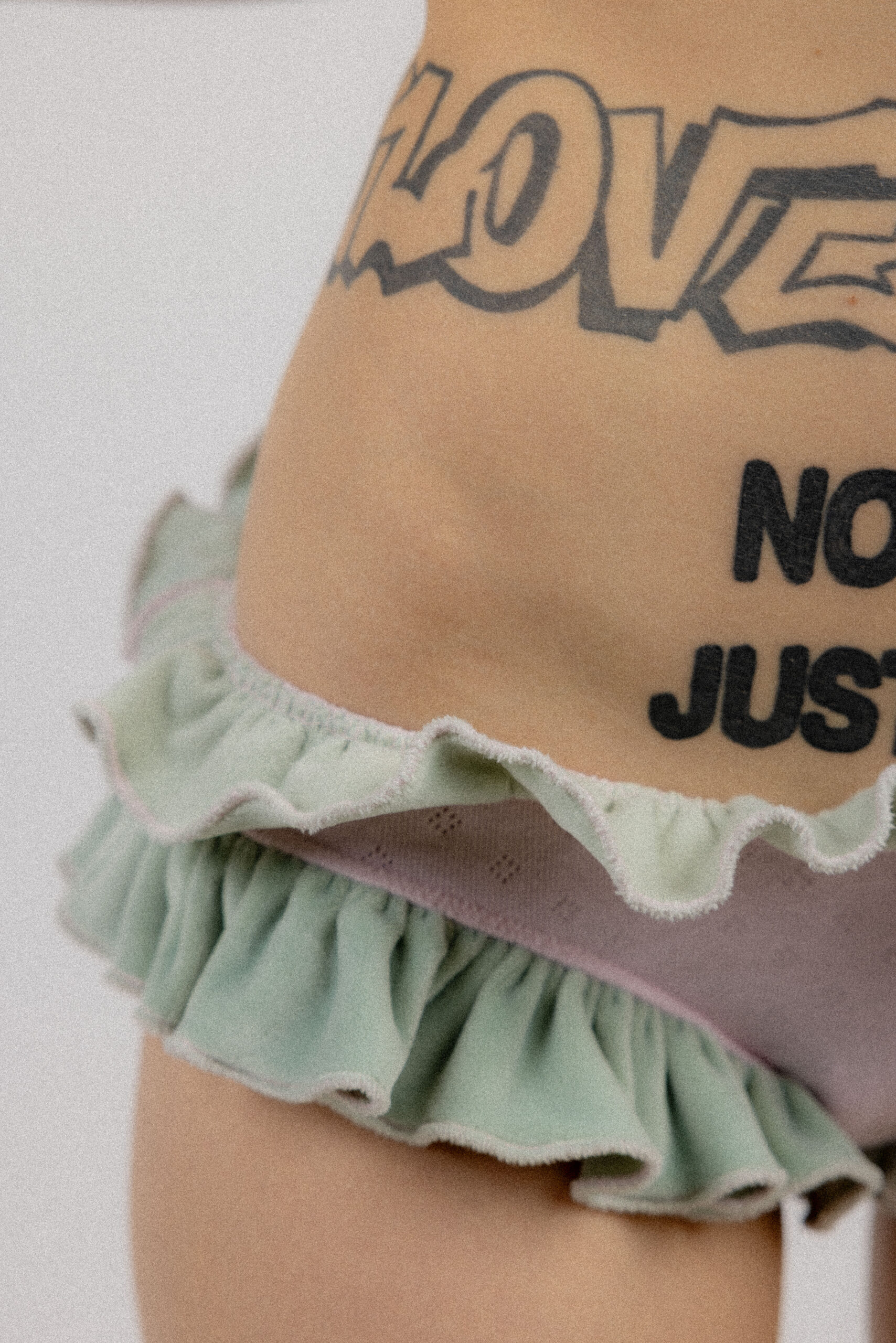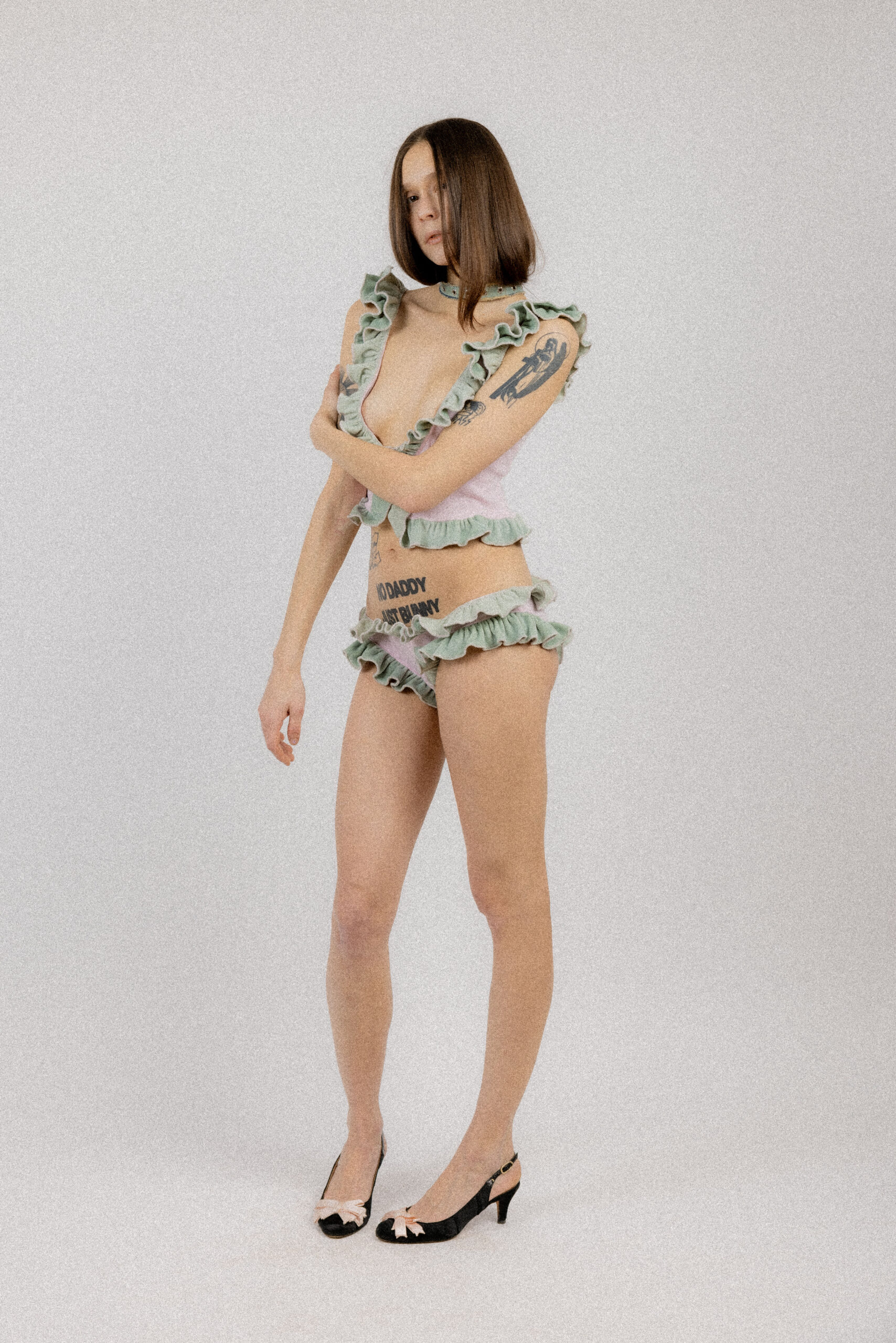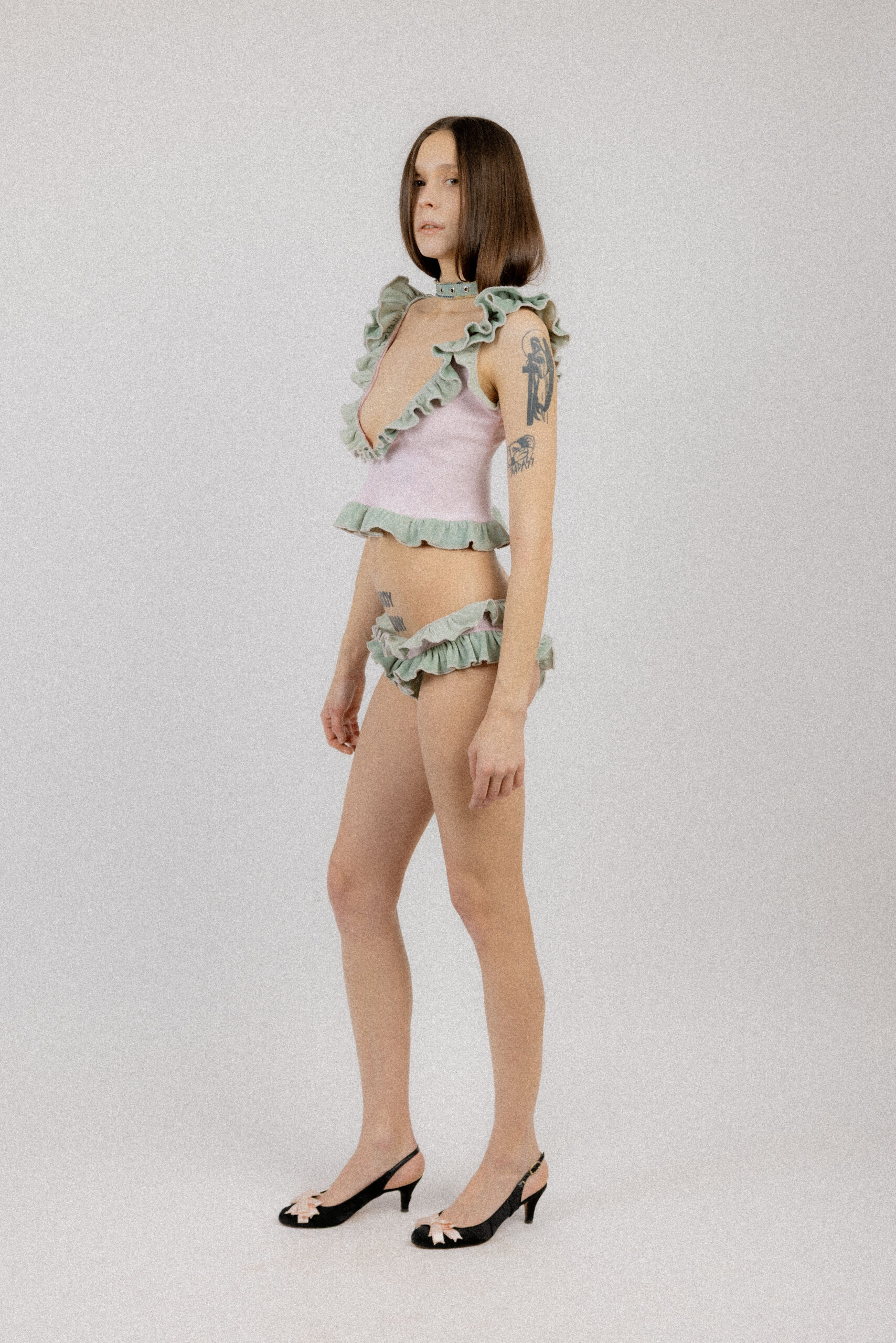MERCI BIMBO set made in three pieces, in velvet and cotton, set of panties, bra and tank top with velvet ruffles.