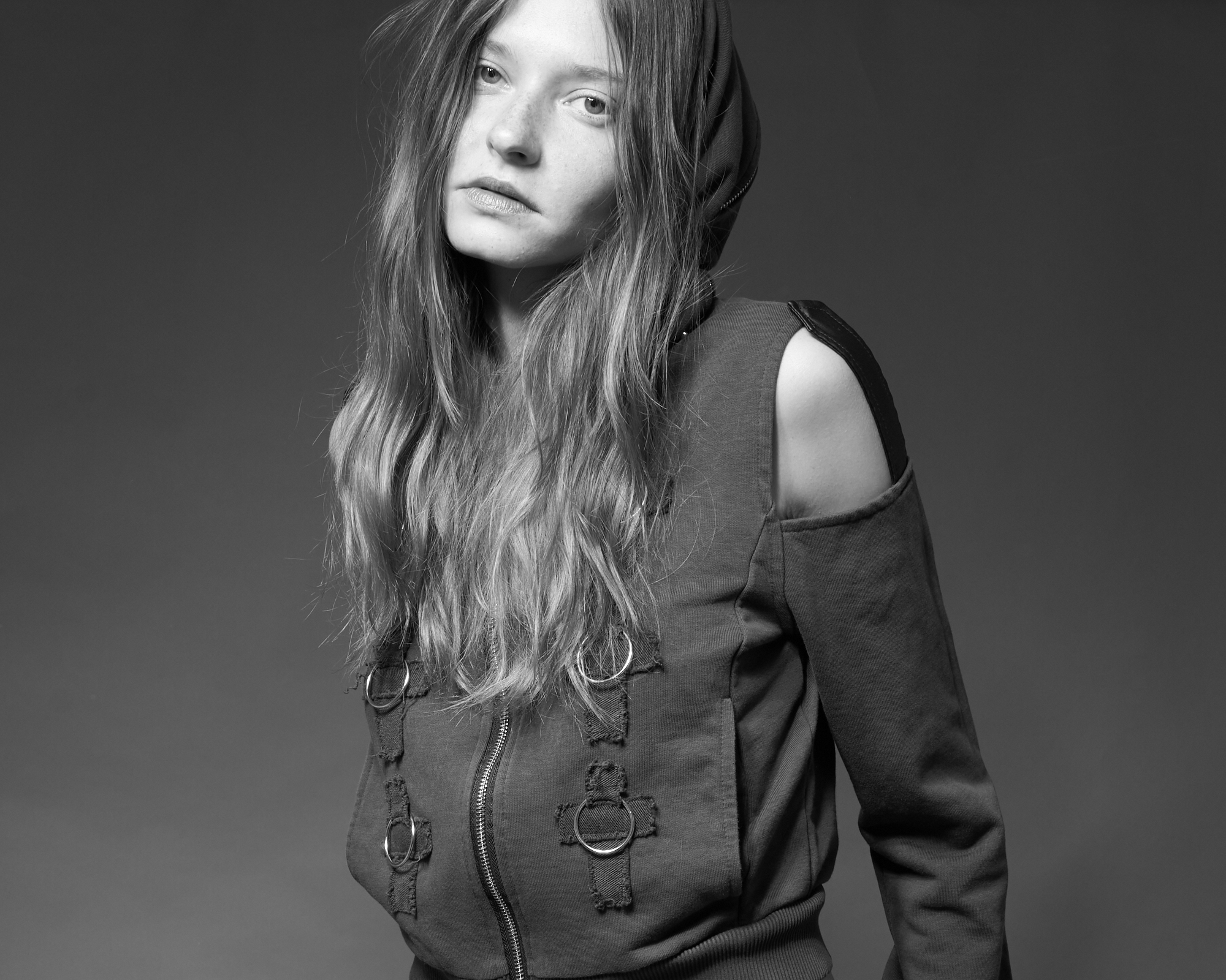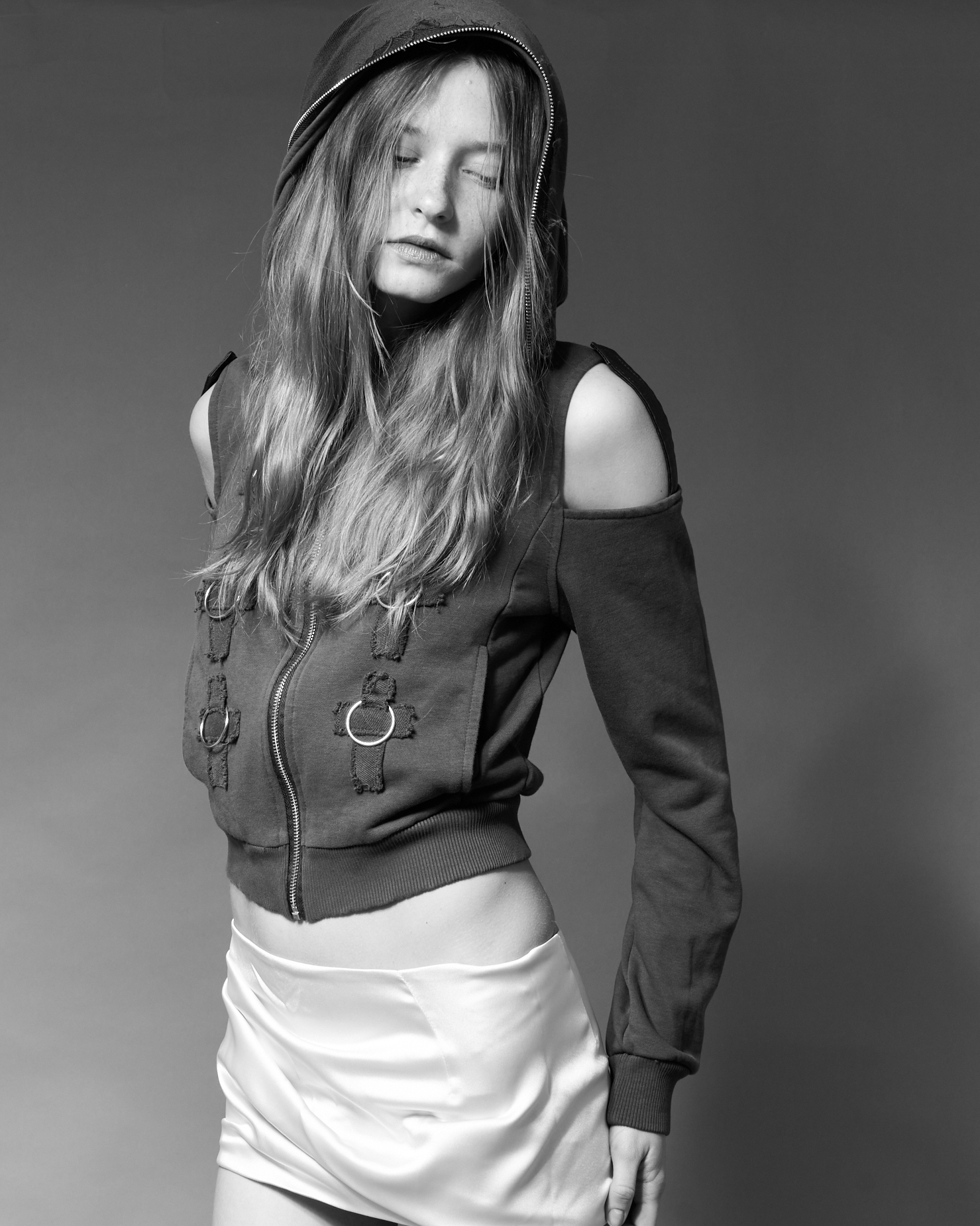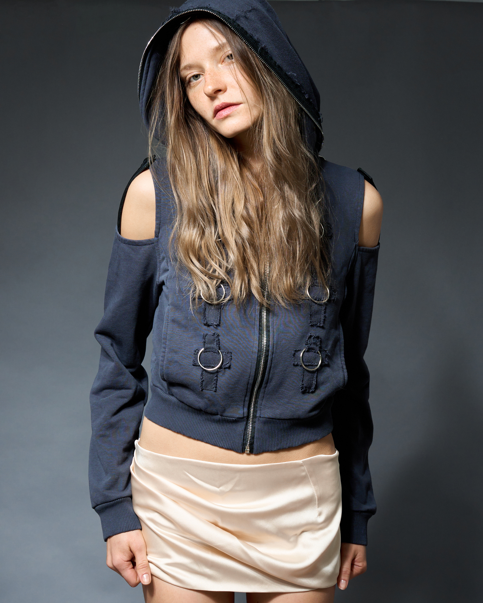 Hoodie with a zipper, pockets and cut-outs, distressed cross shaped patches and metal hardware.